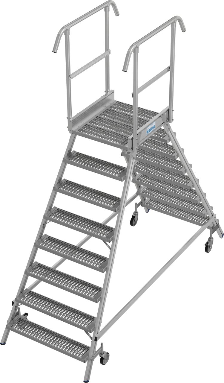 Két oldalon járható gurítható alumínium dobogó mély lépcsőfokokkal és nagy állófelülettel, R13 csúszásmentes profilráccsal a biztonságos és kényelmes munkavégzés érdekében.