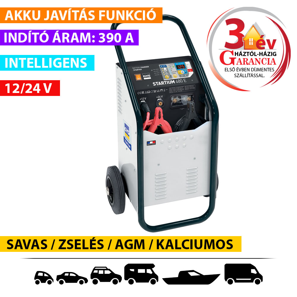 A STARTIUM 480E egy automata töltő-indító, amelyet AGM / Zselé (Stop / Start), savas akkumulátorok töltésére és indítására alakítottak ki, hogy a mai korszerű járműveknél is megállja a helyét.